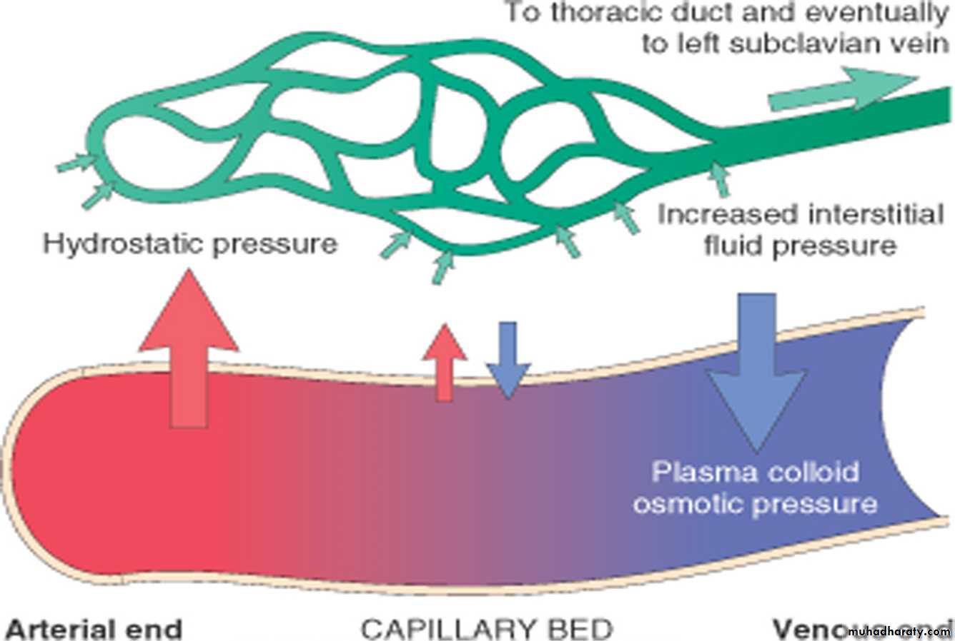 So the exit of fluid into the interstitium from the arteriolar end of the microcirculation is nearly balanced by inflow at the venular end; a small residual amount of excess interstitial fluid is drained by the lymphatics, then to the blood stream via thoracic ductEdema