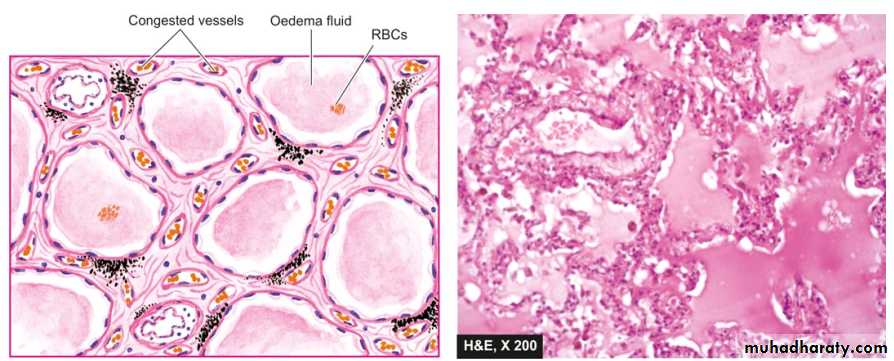 Pulmonary oedema. The alveolar capillaries are congested. The alveolar spaces as well as interstitium contain eosinophilic, granular, homogeneous and pink proteinaceous oedema fluid alongwith some RBCs and inflammatory cells.