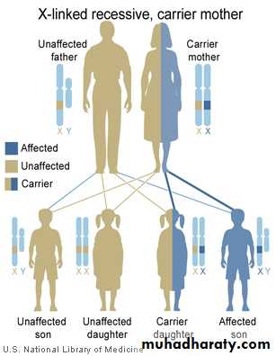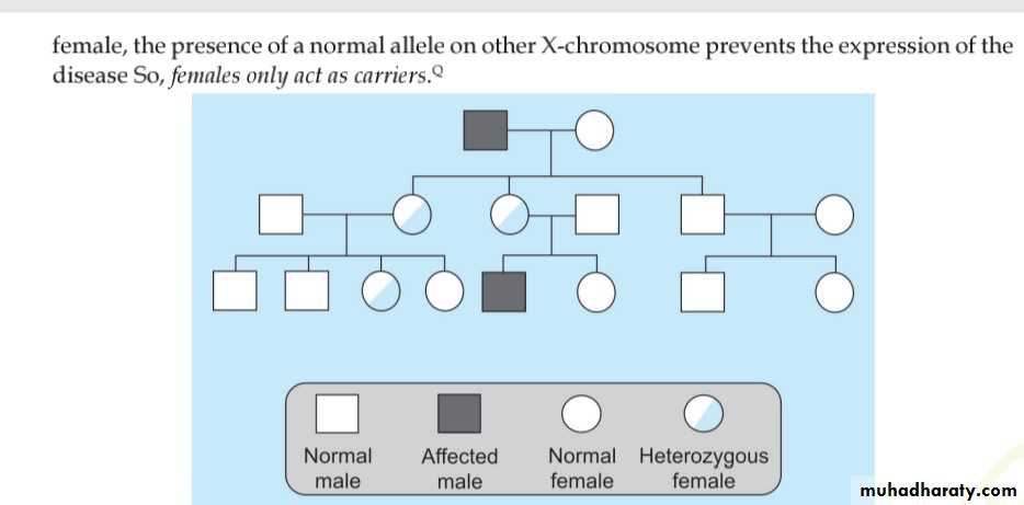 • Females are carriers & males are affected.• The carrier females transmit the disorder only to their sons which have the chance of 50% to be affected.