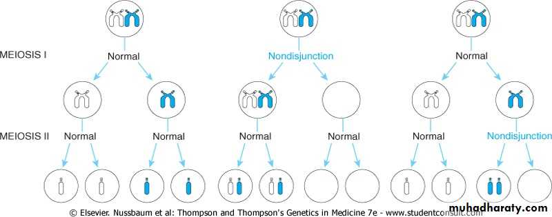 Fertilization of such gametes by normal gamete will result in two types of zygotes: trisomic with extra chromosome (2n+1) (e.g., klinefelter syndrom 47 XXY), or monosomic (2n-1) (e.g., Turner syndrom 45X0).