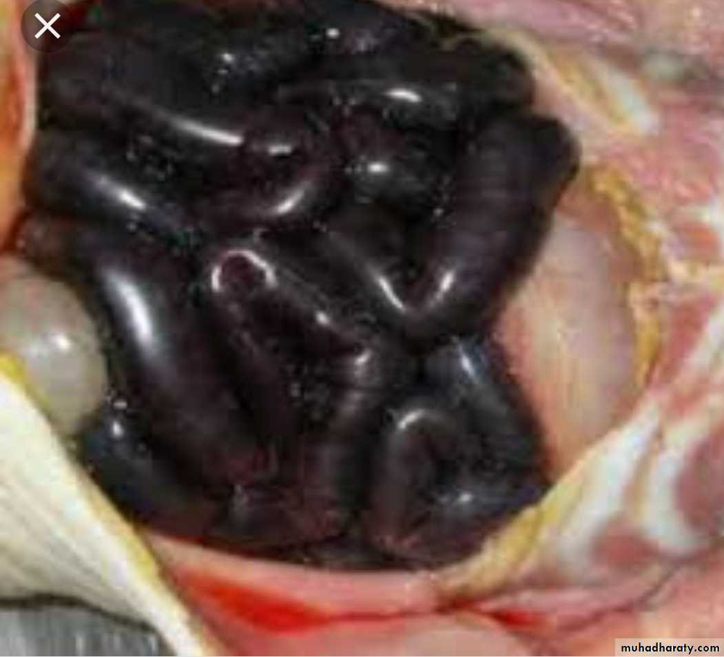These lead to specific changes in the tissue affected by gangrene., black discoloration and bad odor at the affected site like the skin and subcutaneous tissue, intestine, appendix & uterus (puerperal period )