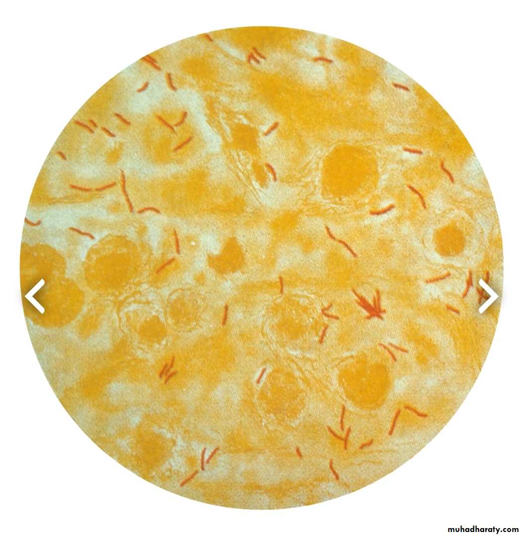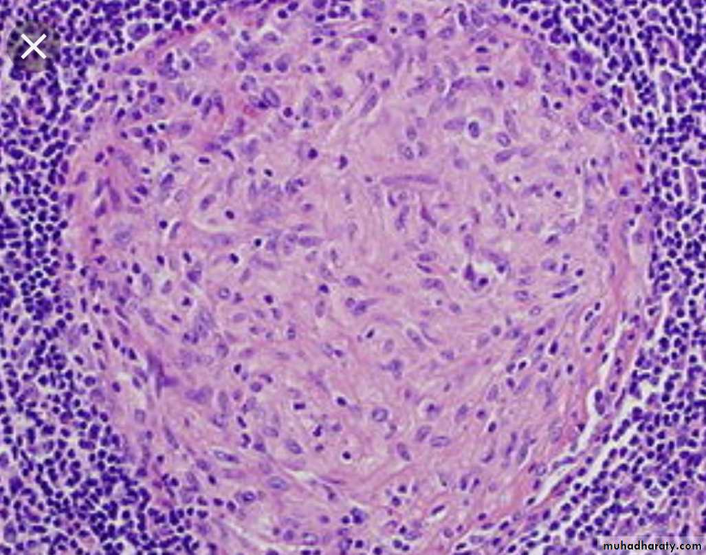 The infection may be terminated at this stage or it may progress to caseous necrosis formation.So the final lesion of TB consist of central area of amorphous, a cellular caseous necrosis, surrounded by macrophages, referred to as epithelioid cells, some macrophages fuse to from multinucleated giant cells, the nuclei of which may be distributed peripherally (Langhans giant cells) these are surrounded by rim of chronic inflammatory cells rich in lymphocytes & at the periphery there is fibrosis.