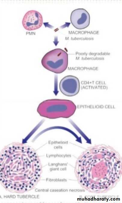 On the initial exposure to the m.o. there is non-specific inflammatory response that resembles inflammation to any form of bacteria, 2-3 weeks later the reaction becomes granulomatous and the center becomes caseous forming typical tubercle