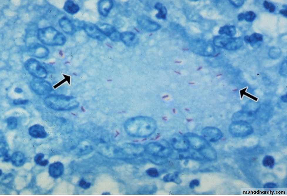 T.B. bacilli produce NO exotoxin or endotoxin. the m.o. escapes killing by being inside the macrophage, proliferate inside the macrophage & prevent fusion of phagosome & lyzosome (phagolysosome).The main lesion is due to cell mediated immunity, the m.o. stimulate the macrophage to secrete TNF-α which causes fever & tissue damage.