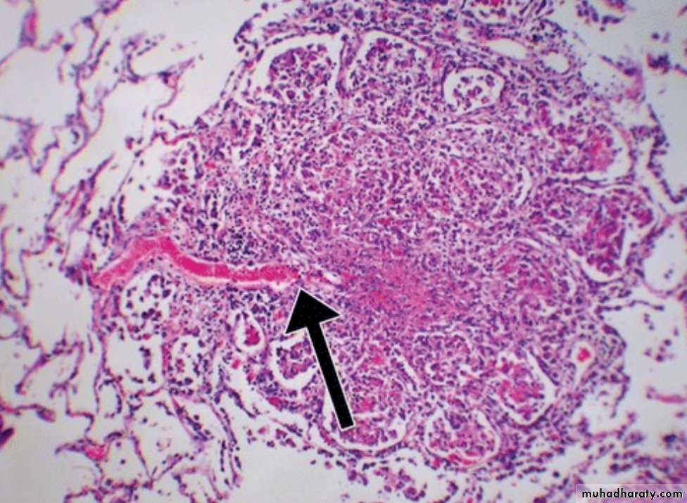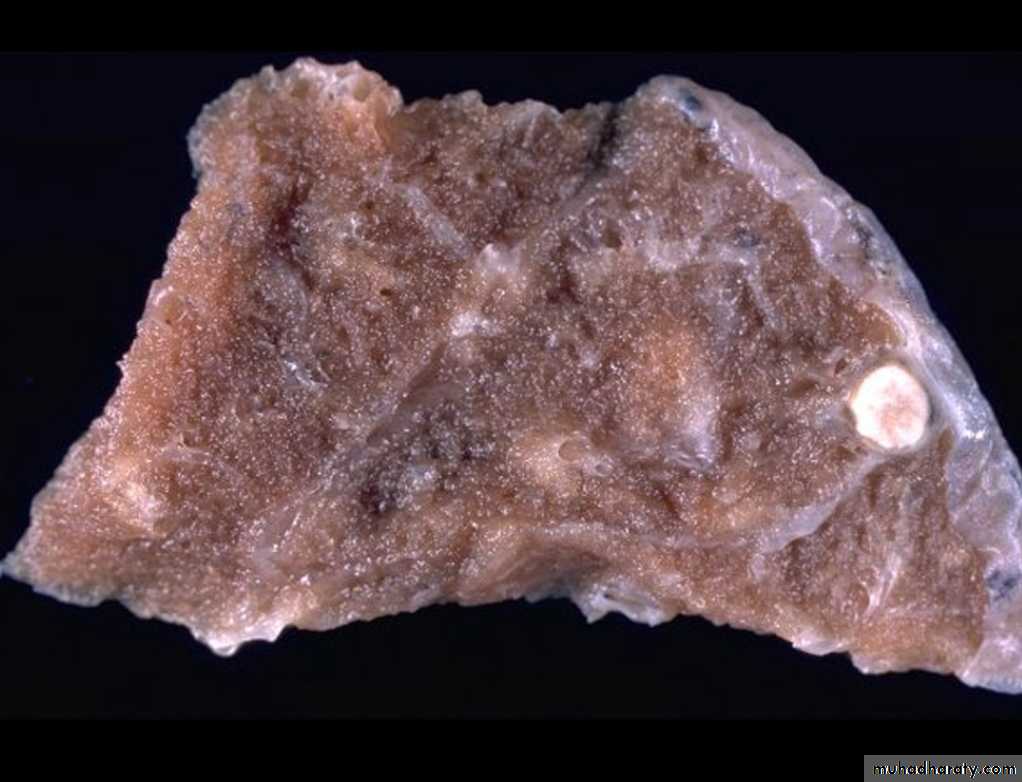 * Grossly: it forms a small sub pleural parenchymal lesion in the mid zone of the lung (Ghon focus) & spread to the hilar lymph nodes, both lesions are called Primary complex (Ghon complex).
