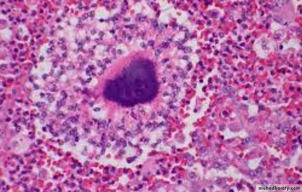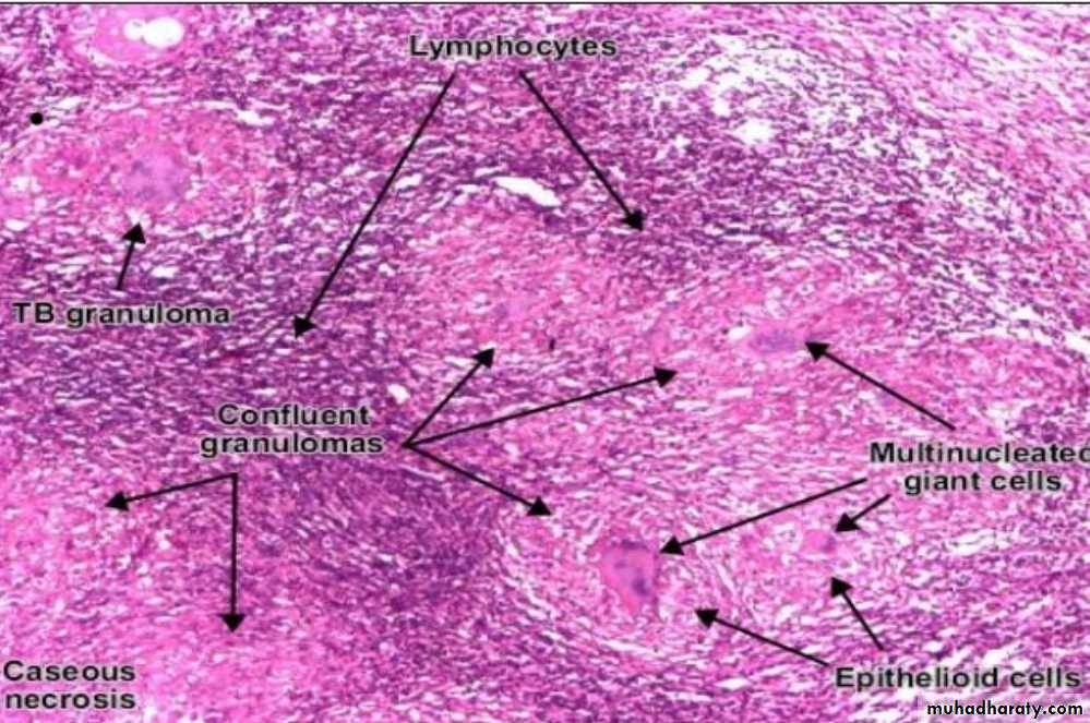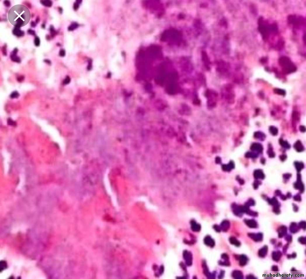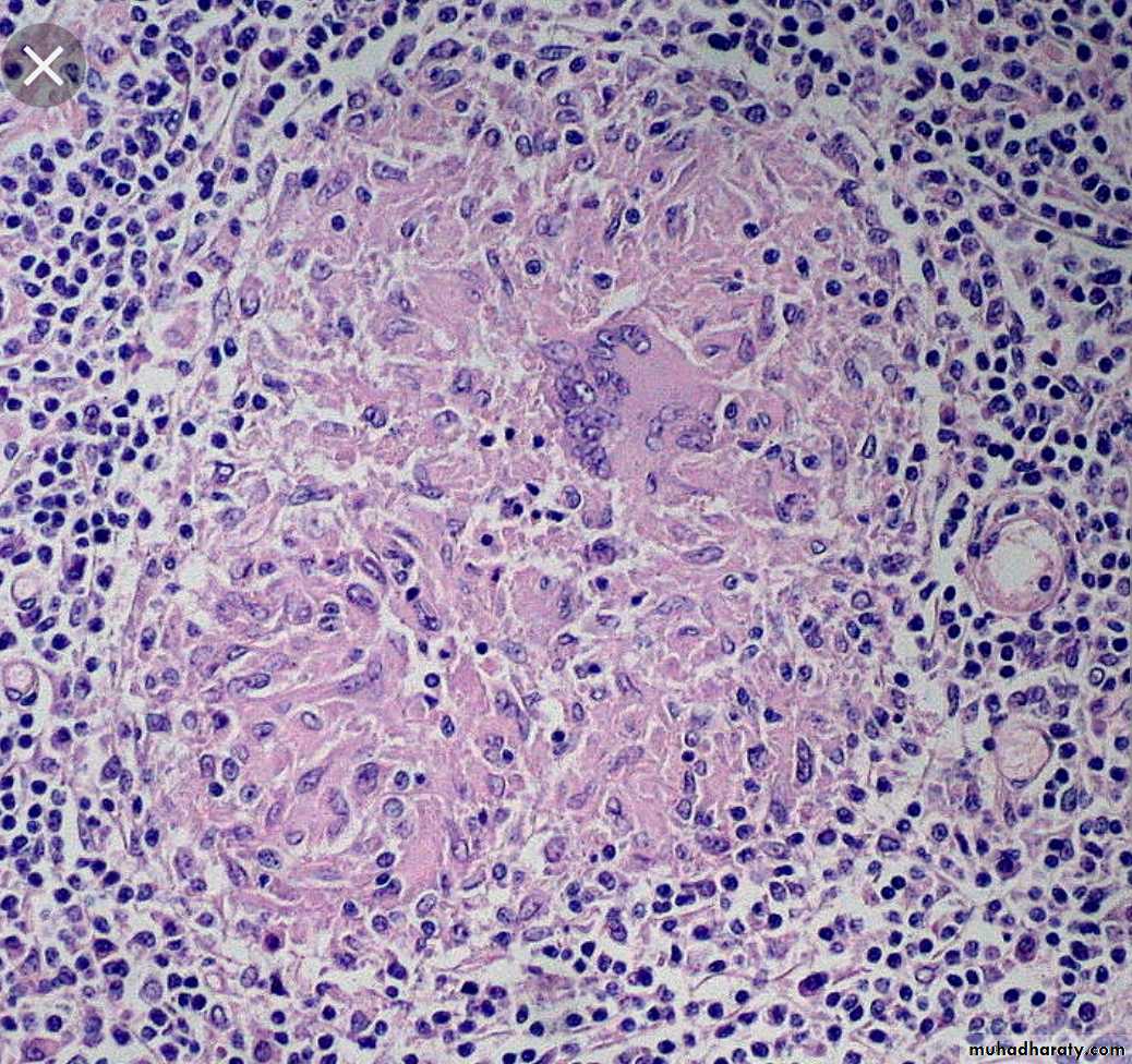 * Microscopically: consist of epitheloid granuloma with central necrosis.