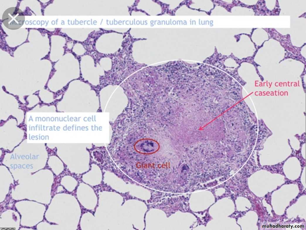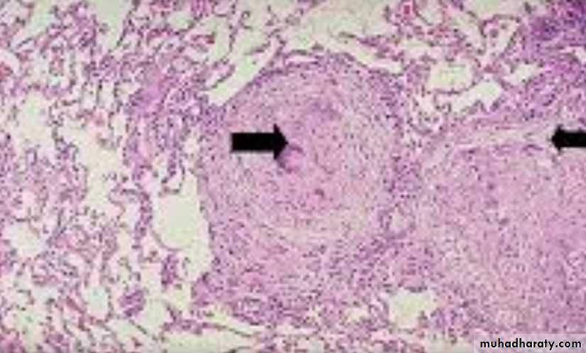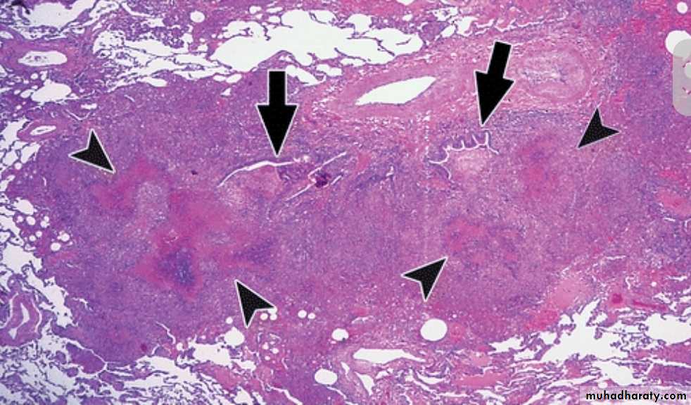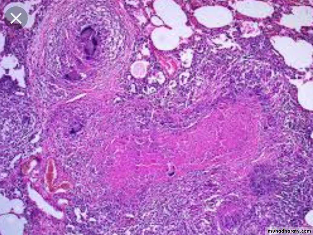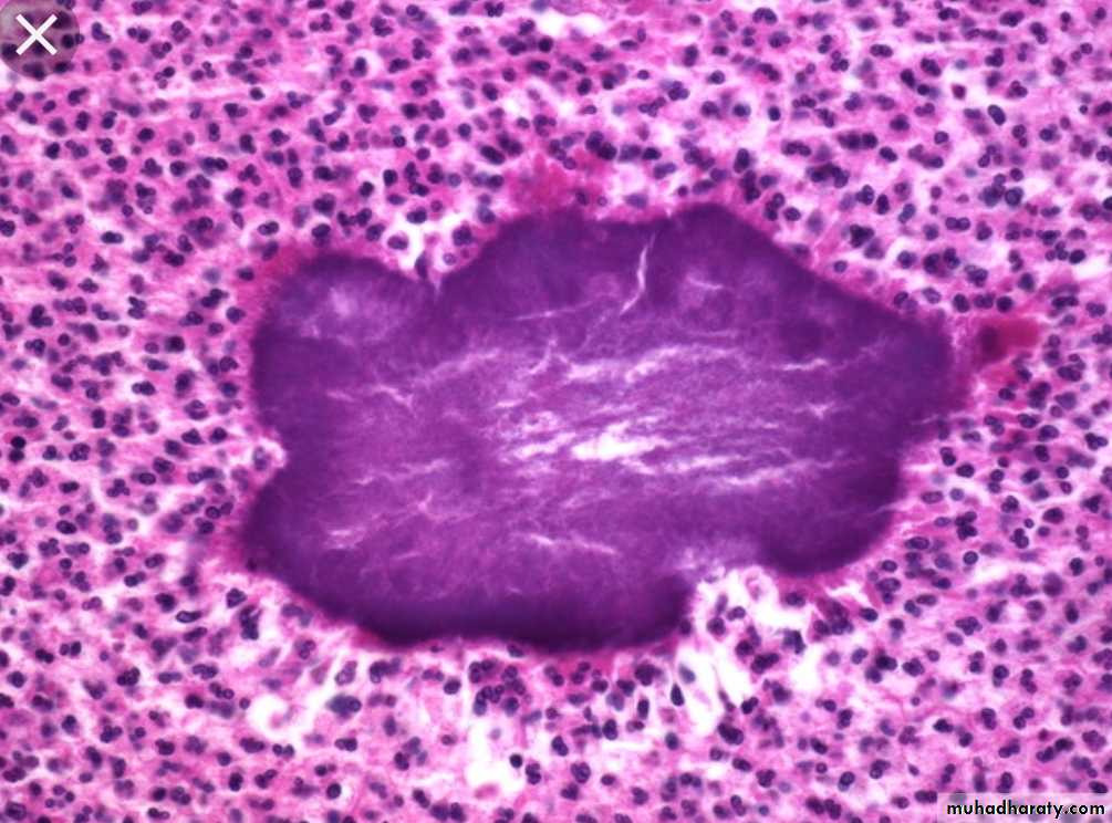 * Microscopically: consist of epitheloid granuloma with central necrosis.