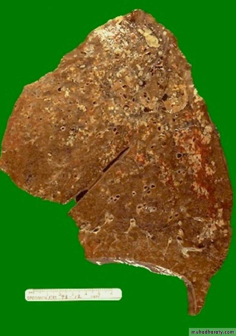 Either occurs as a reinfection by mycobacterium TB or reactivation of primary infection when there is impairment in the immunity of the patient.Grossly: usually occurs at the apex of the lung with minimal lymph node involvement. There is marked damage in the lung parenchyma with cavity formation