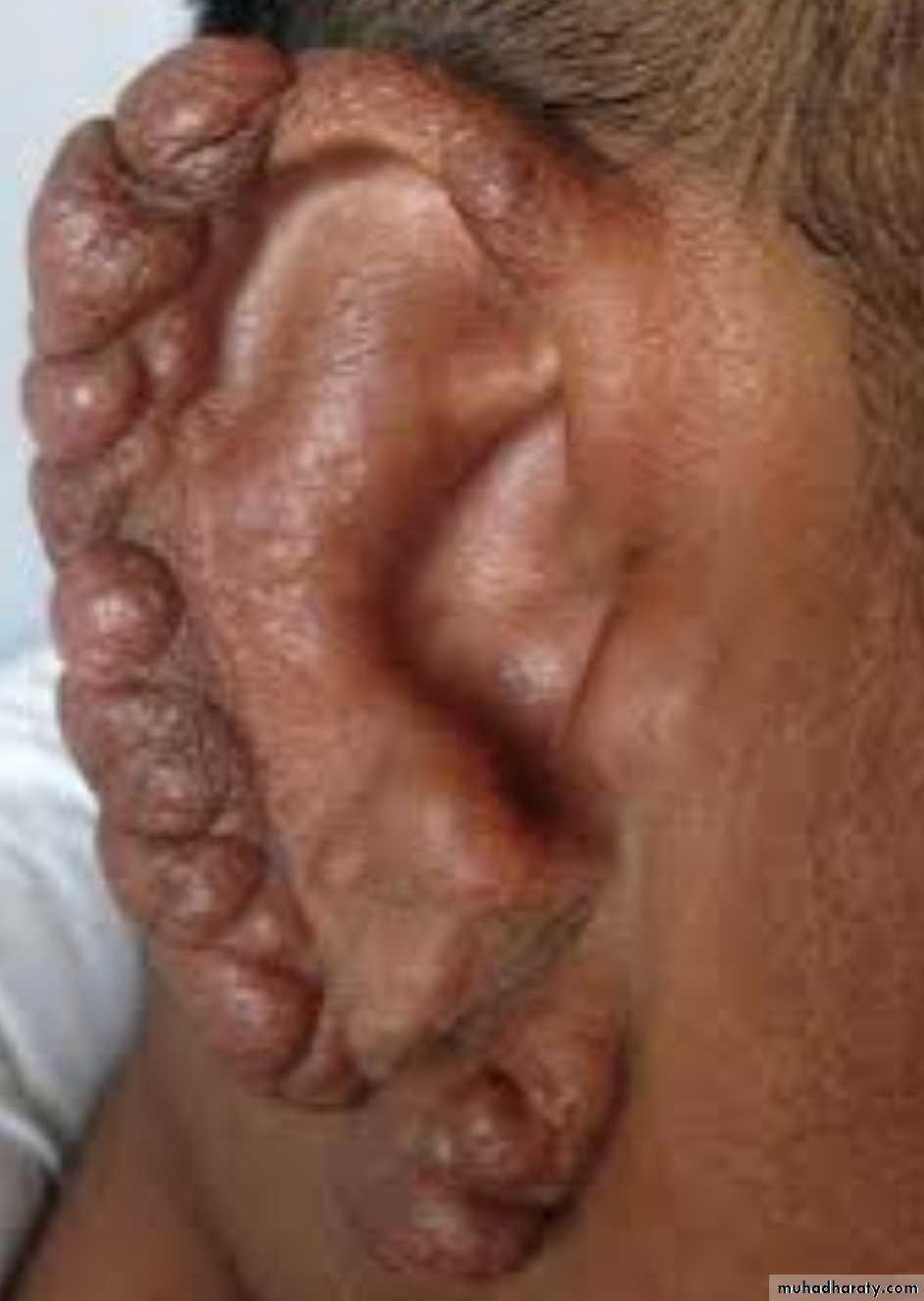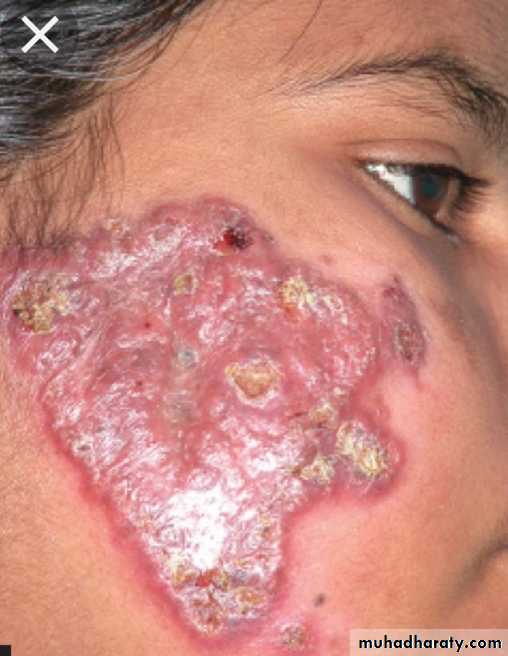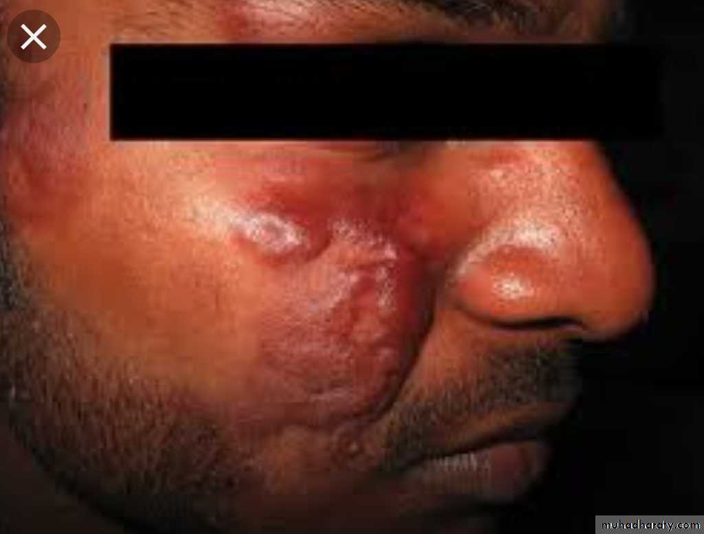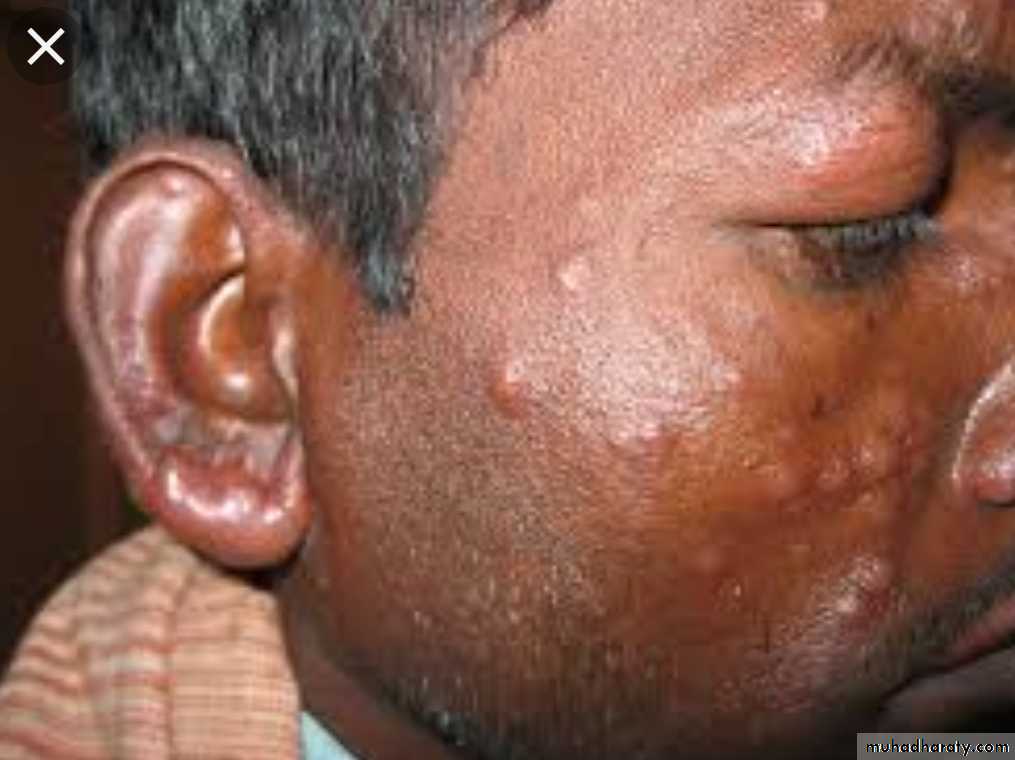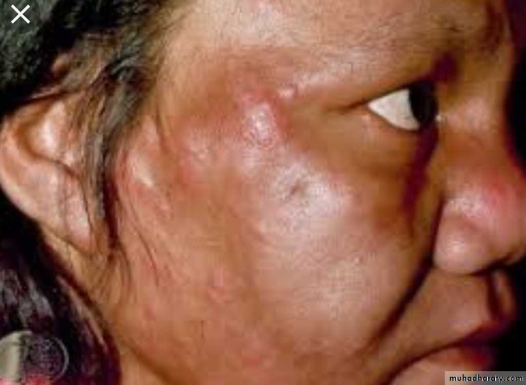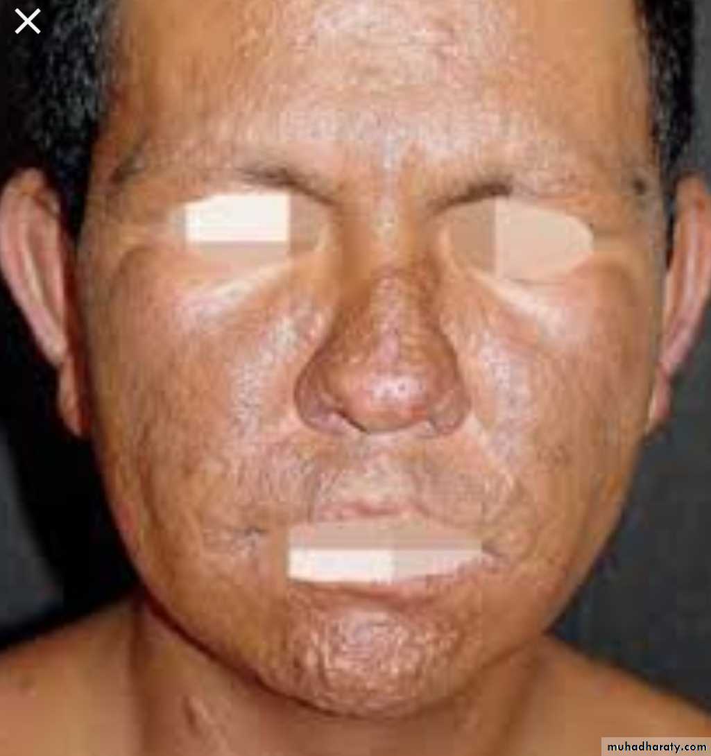 Macular, papular, or nodular skin lesion seen in the skin of the face, ears, wrists, elbow & knees. Disease progression causes coalesce of the facial lesions (Leonine facies), the lesions are anesthetic or hypo-esthetic.Involvement of eye, URT down to the larynx , testis etc.