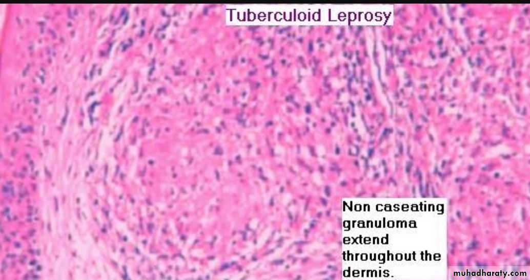 Most of the patients get rid of the bacilli by natural resistance• If the host mounts T-cell immunity, tuberculoid leprosy with epitheloid granulomas occurs.