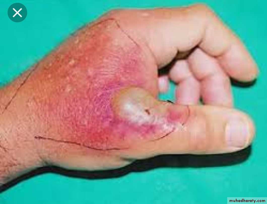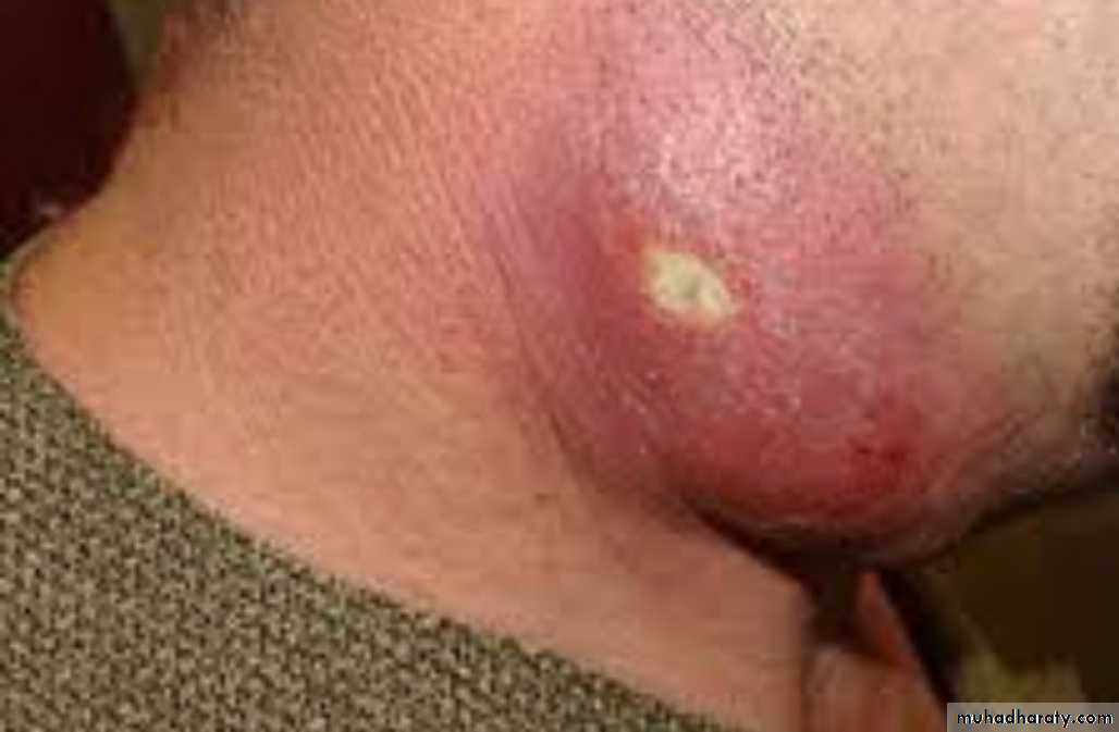 Grossly : a red swollen mass, the middle is filled with pus & debris, surrounding skin appears pink/red