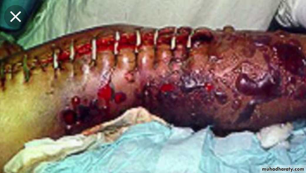 Marked odema and necrosis of the involved muscle, wih large bullous/vesicles that may rupture producing serosanguinous exudateWet gangrene