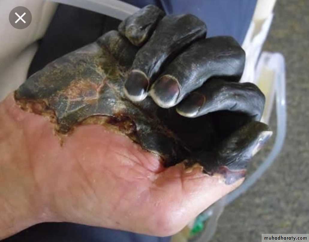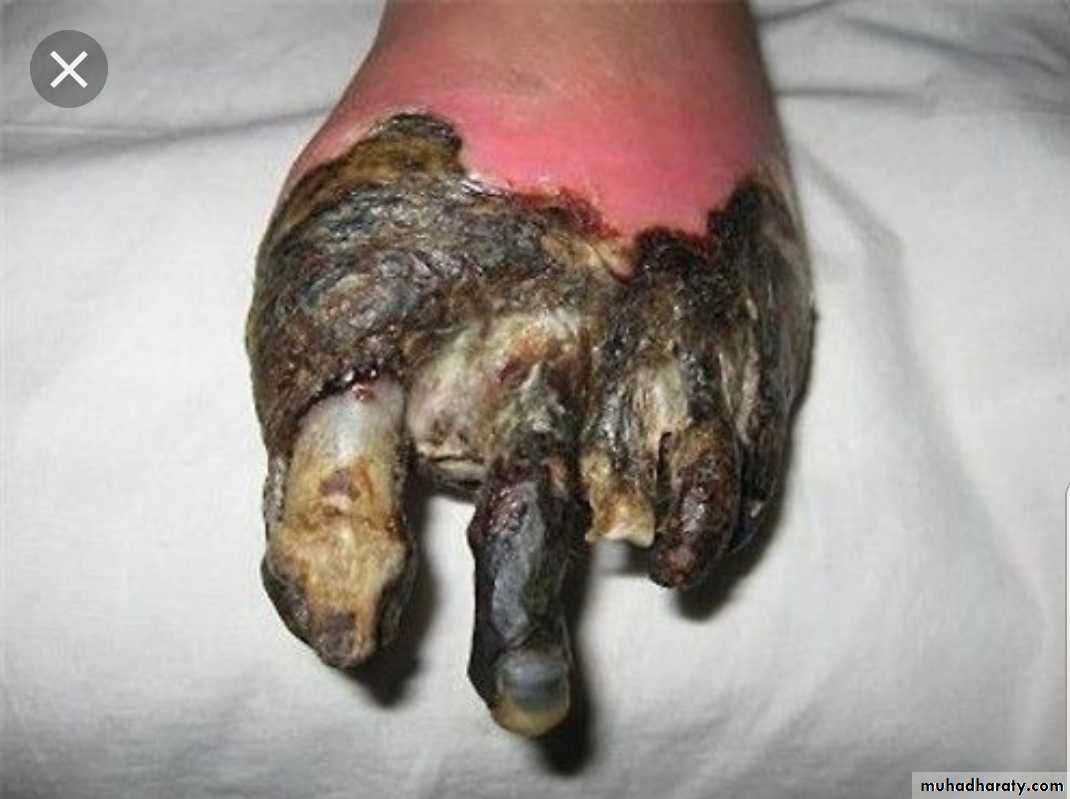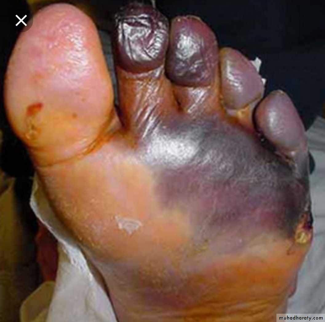 Reddish/brown/black discoloration of the moist planter surface of the foot with skin ulceration, hemmorage & dirty necrotic base. No line of demarcation between dead & live tissuee.Dry gangrene