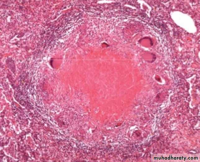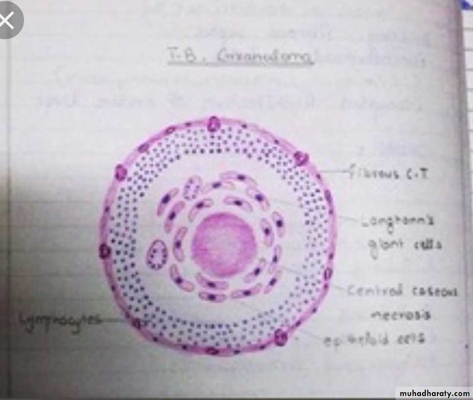 a small sub pleural parenchymal lesion in the mid zone of the lung (Ghon focus),may spread to the hilar lymph nodes, both lesions are called Primary complex (Ghon complex).Well-defined granulomas are seen here. rounded outlines, contains several Langhans giant cells. Granulomas are composed of transformed macrophages called epithelioid cells along with lymphocytes, occasional PMN's, plasma cells, and fibroblasts. The localized, small appearance of these granulomas suggests that the immune response is fairly good.