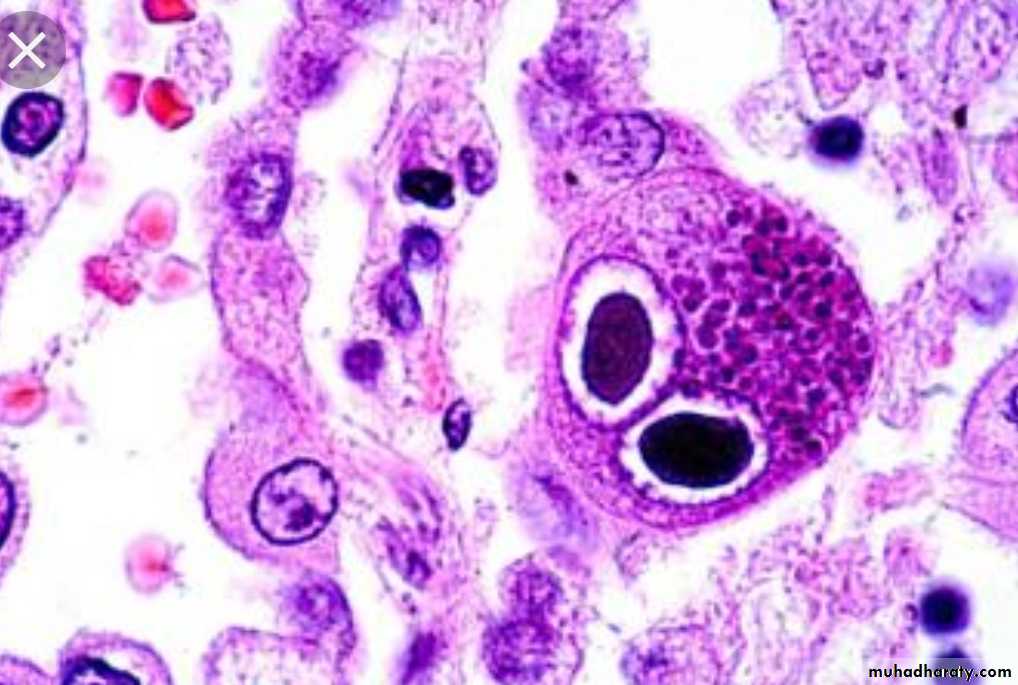 Measles , RSV , para inlf. V.Perinuclear clearing & basophilic staining cytoplasmic inclusion bodies (owl’s eye appearance) CMV infection