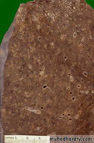 When the immune response is poor or is overwhelmed by an extensive infection, then it is possible to see the gross pattern of granulomatous disease seen here. This is a "miliary" pattern of granulomas because there are a multitude of small tan granulomas, about 2 to 4 mm in size, scattered throughout the lung parenchyma.