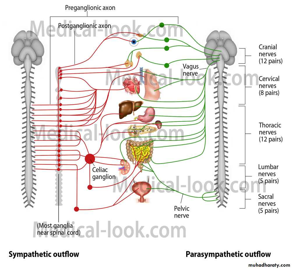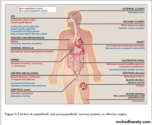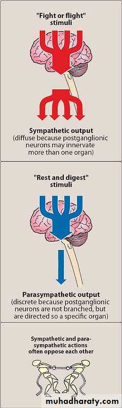 1.In response to stressful situations such as trauma, fear, hypoglycemia, cold and exerciseThe effect of stimulation of sympathetic division is increase heart rate and blood pressure, to mobilize energy stores of the body and to increase blood flow to skeletal muscle and the heart divert flow from skin and internal organs vasodilatation in coronary artery of the heart dilatation of pupils and bronchioles, also affect GIT motility, function of bladder and sexual organs.