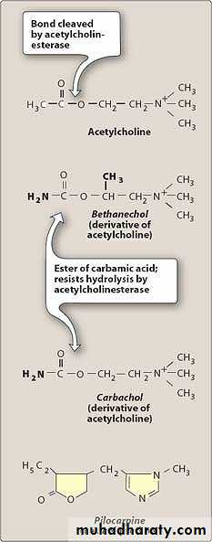 a- Pilocarpine-Tertiary amine (penetrate CNS) hydrolyzed by Achestrase have muscarinic activity, used in ophthalmology.
