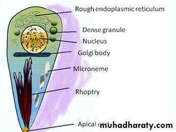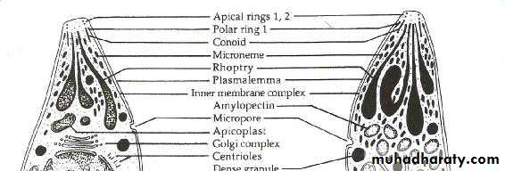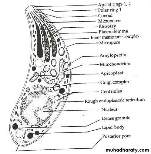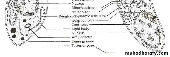 Bradyziote differ structurally only slightly from tachyziote. They have situated toward the posterior end whereas the nucleus in tachyzoite is more centrally located