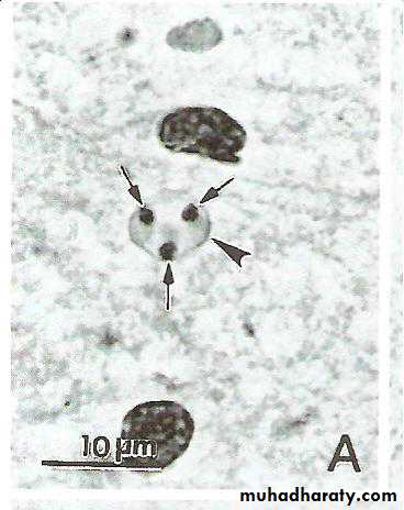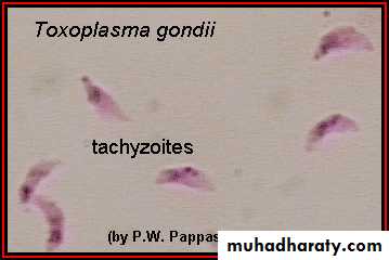 The term tachyzoite (tachos = speed in Greek), to describe the stage that rapidly multiplied in any cell of the intermediate host and in non-intestinal epithelial cells of the definitive host.The tachy is crescent – shaped, with one end pointed and the other end rounded. The nucleus is ovoid and situated near the blunt end of the parasite. It can invade any nucleated cell and replicate within cytoplasmic vacuoles by a processes called endodygony or internal budding – daughter trophoziote being formed.