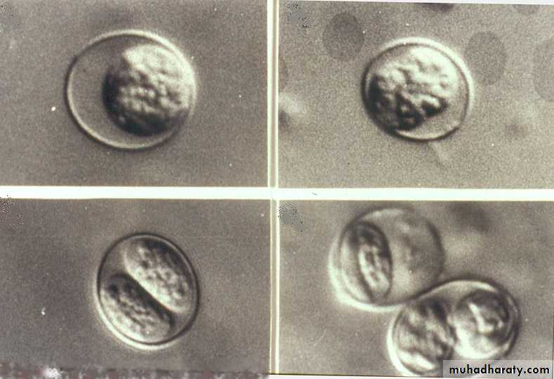 The freshly passed Oocyst is not infectious. It becomes infections only after development in soil or in water for a few days. During this state of sporulation, the sporoblast divides in two sporcysts and four sporozoite is the infective from.