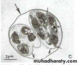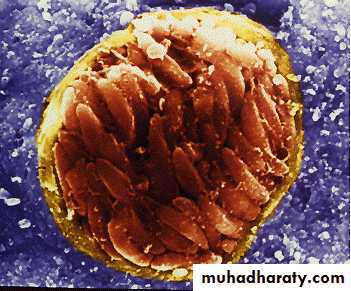 TISSUE CYSTSFollowing sporulation in the environment, oocysts containing sporozoites which are infective, and give rise to tachyzoites when ingested by an intermediate host.