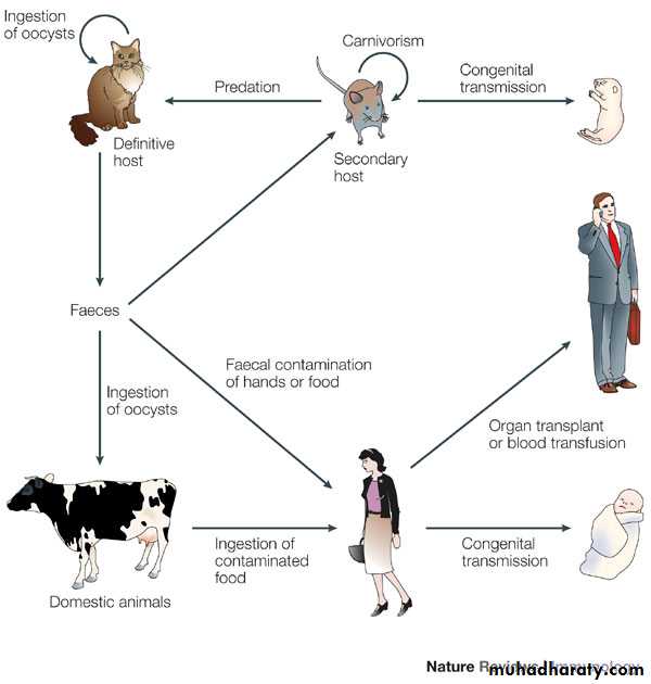 • Fertilization occurs in the intestine, and immature oocyst are passed in the cat’s feces. The oocyst contaminate water, food and soil are ingested by intermediate host.