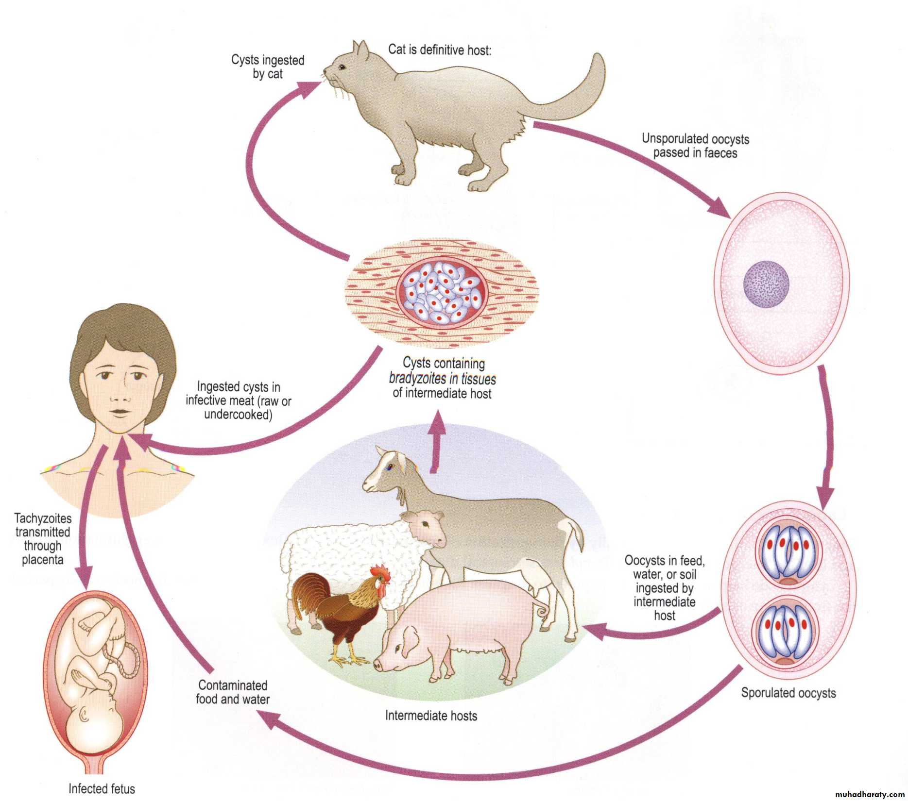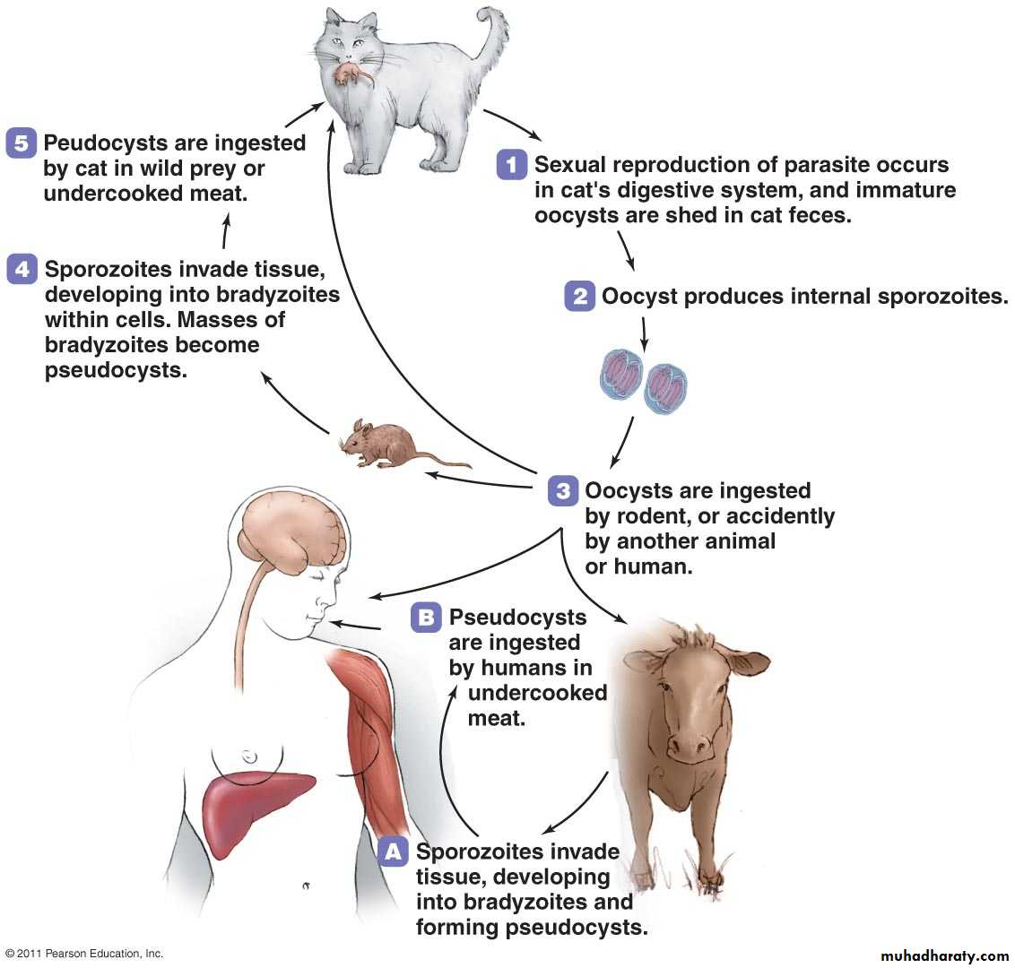 The life cycle of T. gondii consists of two stages Asexual and sexual:Asexual stage takes place in the intermediate hosts, which are mammals (human) and or bird (During this stage rapid intracellular growth of the parasite as tachyziote takes place).
