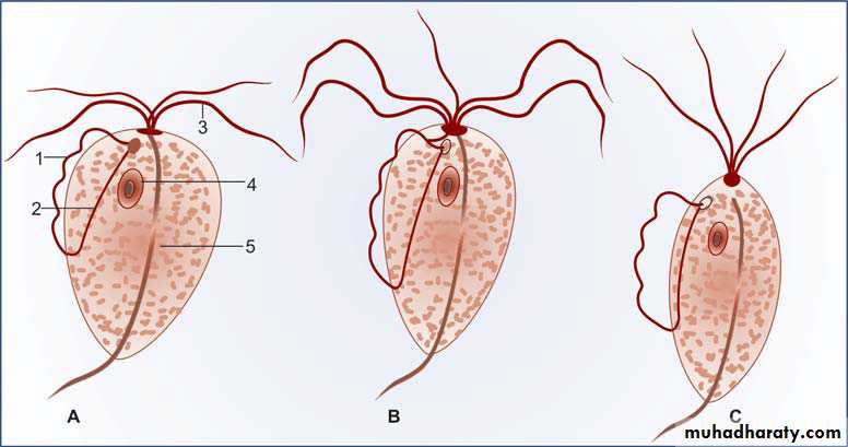 Trichomonas species. (A) T. vaginalis, (B) T. hominis, (C) T. tenax. 1—Undulating membrane, 2—Costa, 3—Flagella, 4—Nucleus, 5—Axostyle