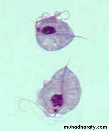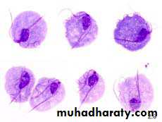 Morphologically T. vaginalis has only the trophozoite stage, resembling other trichomonads.All the trichomonads are morphologically similar, having a pear-shaped body 7- 23 μm long, a single anterior nucleus, three to five forward-directed flagella, and a single posteriorly directed flagellum that forms the outer border of an undulating membrane.