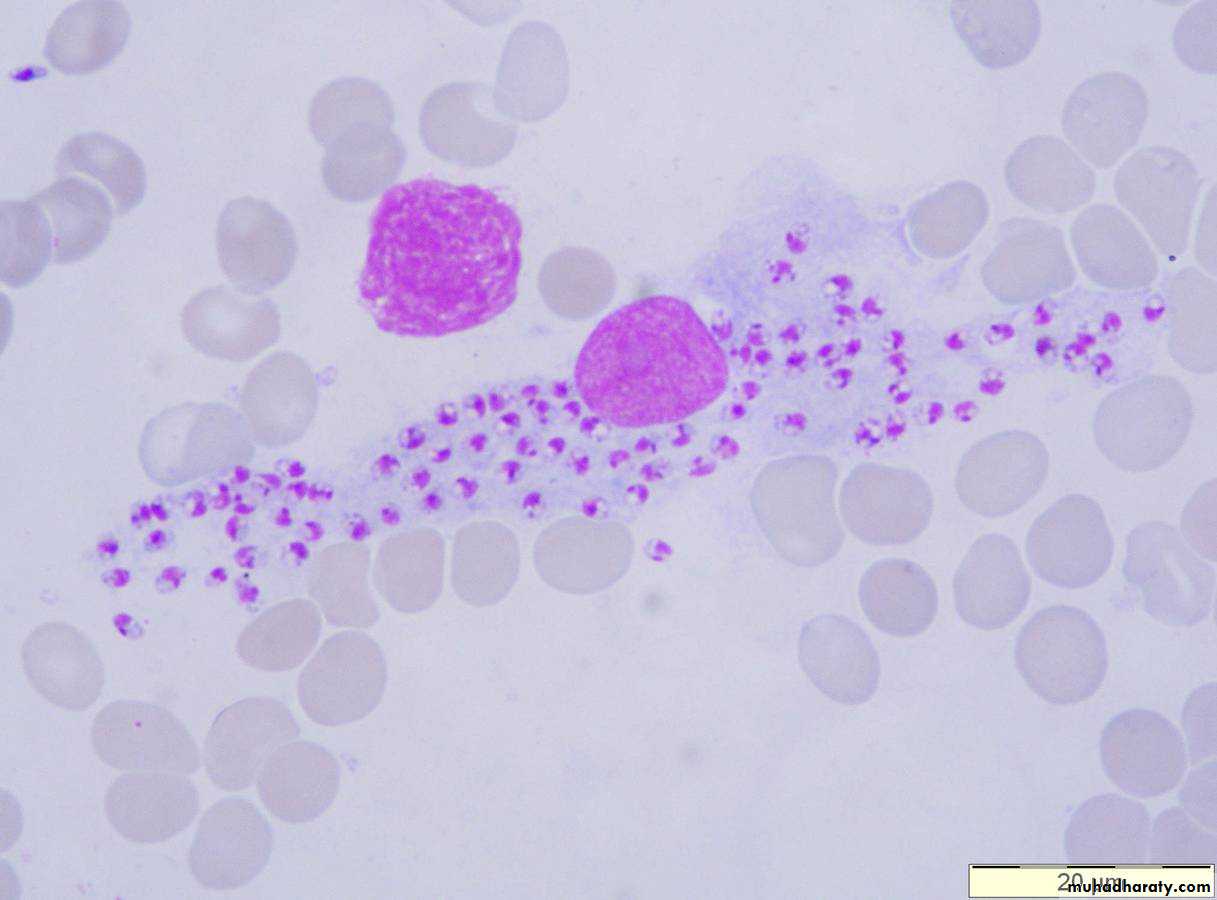 Smears stained with Leishman, Giemsa or Wright stains show a pale blue cytoplasm enclosed by a limiting membrane.