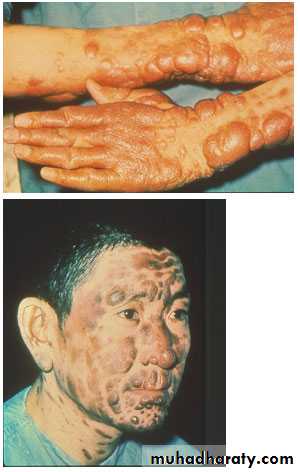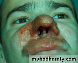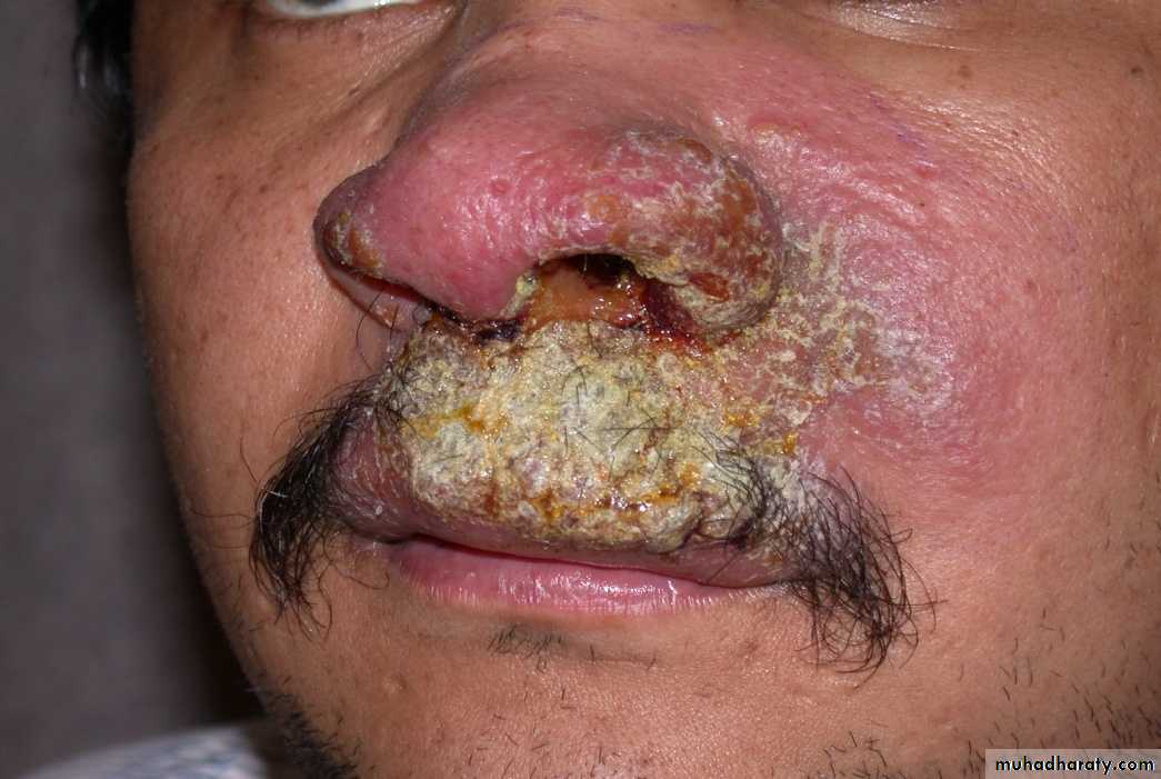 The infected macrophages will spread from the original site and cause secondary skin lesions or invade mucosal tissue, especially around the mouth and nose, results in a disfiguring disease in which the cartilage of the nose and surrounding tissue is destroyed.
