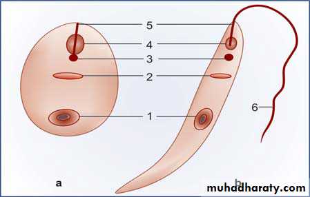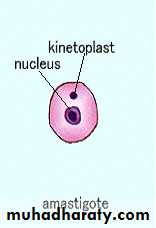 a. Amastigote b. Promastigote. 1. Nucleus 2. Parabasal body 3. Blepharoplast 4. Vacuole 5. Axoneme 6. Flagellum• 1. Amastigote shape:- found in final host, infect the Liver ,Spleen ,bone marrow ,lymph nodes and macrophage. It is Roundish to oval in shape, Consist of a nucleus and kinetoplast. The large single nucleus is typically located off-center.