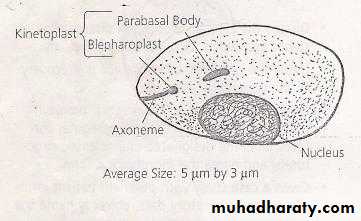 The dot like blepharoplast is attached to a small axoneme, this axoneme extends to the edge of the organism. The single parabasal body is located adjacent to the blepharoplast.