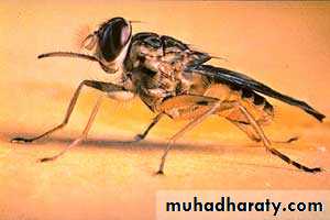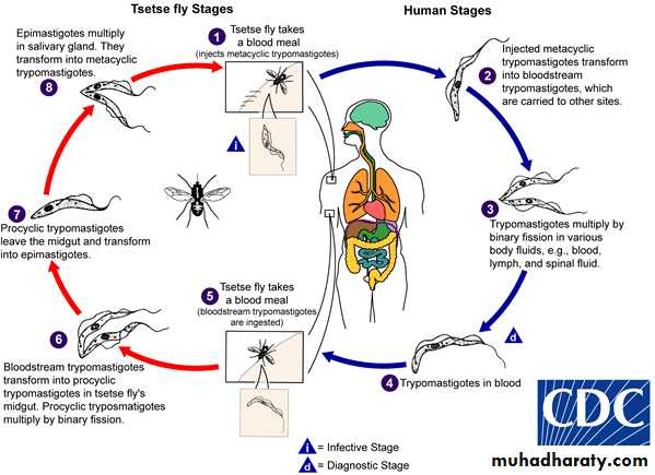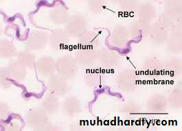 Human African trypanosomiasis, its a vector-borne parasitic disease, its actively motile, fusiform protozoa, flattened from side to side, the flagellum project from the anterior end, large single oval nucleus with central karyosome and long undulating membrane, transmitted to humans by tsetse fly (Glossina genus) bites which have acquired their infection from human beings or from animals harboring the human pathogenic parasites.