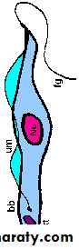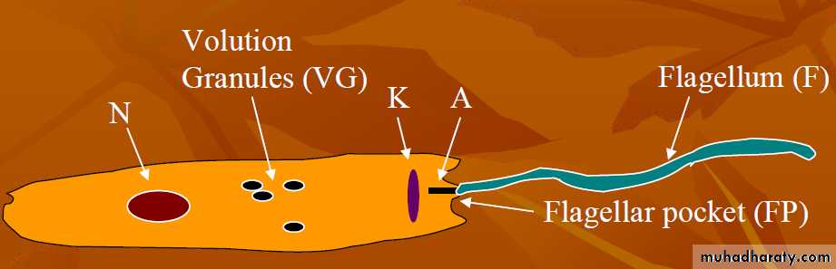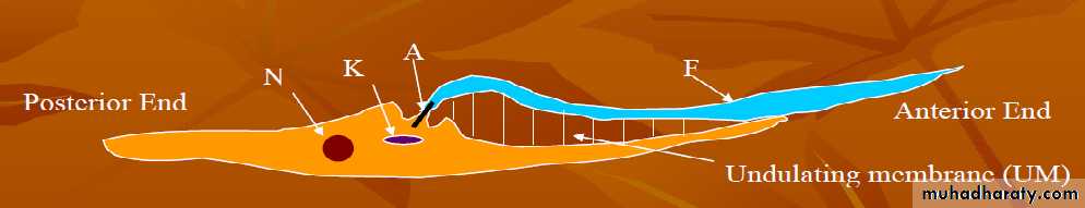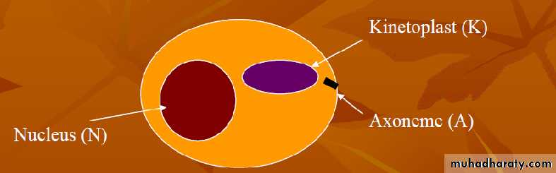 Morphology- exhibits a characteristic “C” shape with an undulating membrane and anteriorly extending flagellum; the amastigote is oval, averages 3 to 5 microns in diameter and contains a nucleus and rod-shaped kinetoplast.