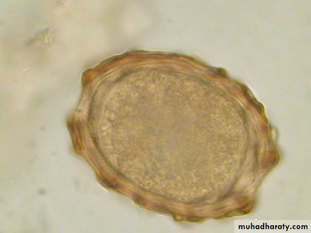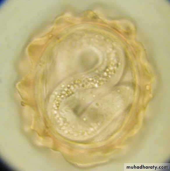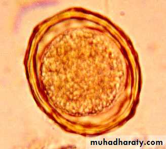 • Shell: Unfertilized eggs has a thin shell protects the inner a morphous mass of protoplasm, Irregular albuminous layer, not has crescent space. The shell layers of the egg provide a very resistant structure which can withstand many chemicals which make them ideal parasites of the intestine.