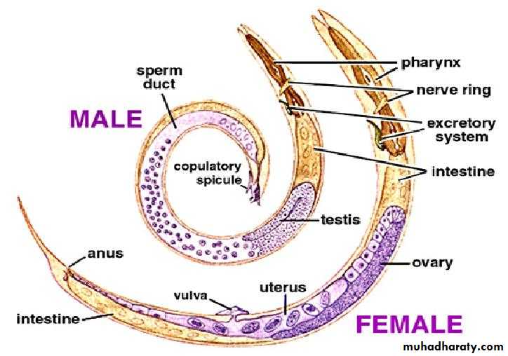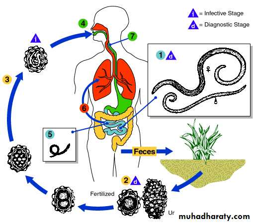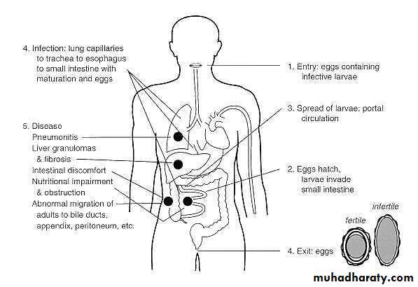 When swallowed, the larvae pass down into the small intestine where they develop into adults. The time from the ingestion of embryonated eggs to ovi-position by the females is about 60-75 days. The adult worms live for about one year.