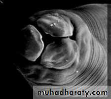The mouth at the anterior end of both male and female has three finely denticulate lips, one dorsal and two ventro-lateral.