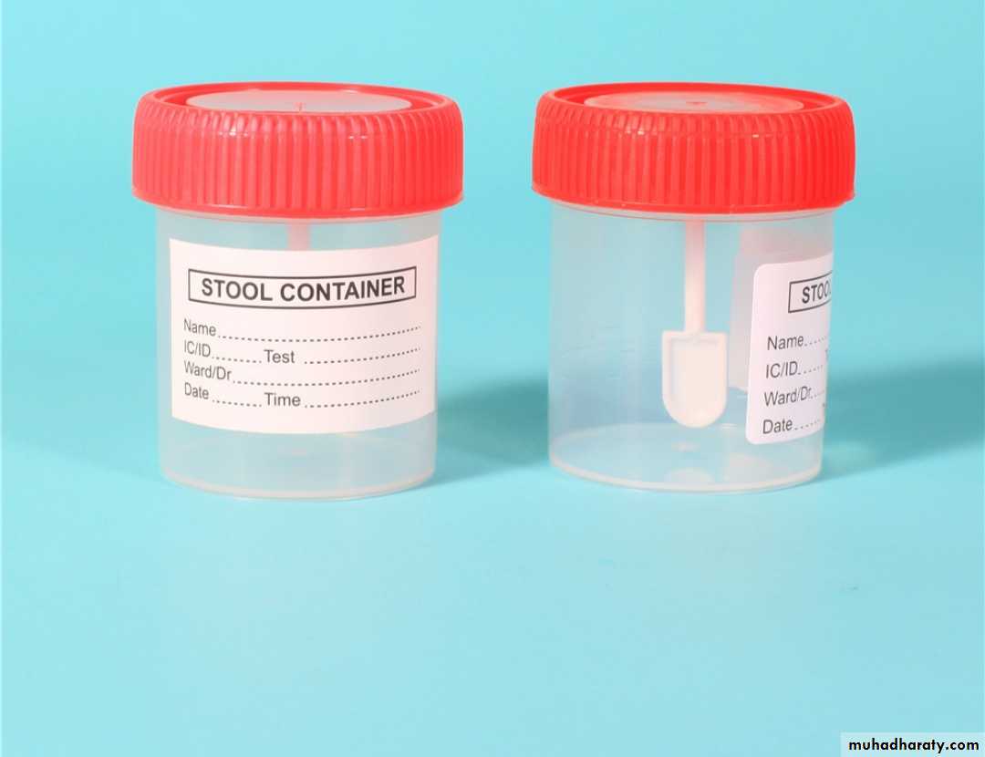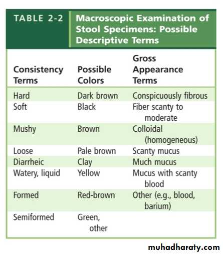 Once a stool sample had been received in the laboratory, the analytic phase of laboratory begins.Macroscopic examination:
