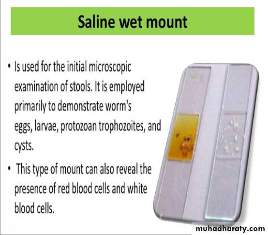 • Drop of 0.85% saline on glass slide .• Unfixed stool on glass mixed with wooden stick.