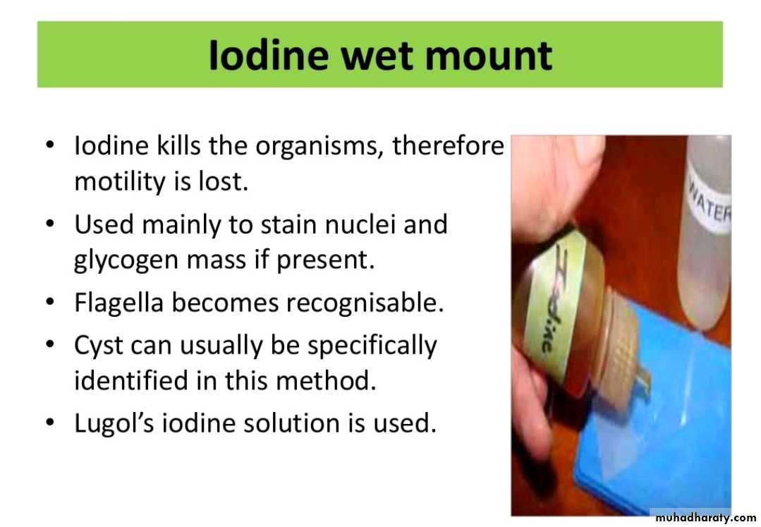 Used to confirm the presence of protozoa cysts and trophozoite.