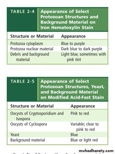 Two permanent stains :- Wright stain and Giemsa stain(the preferred stain because it allow for the detection of parasite details).