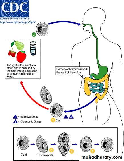 • Cyst exyst in the small intestine releasing trophozoites that migrate to the large intestine. Trophozoites reside in the lumen of large intestine Invade mucosa and sub M.• Feed on mucosal cells, RBC, leukocyte