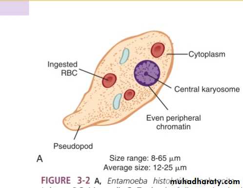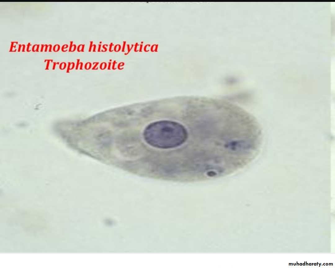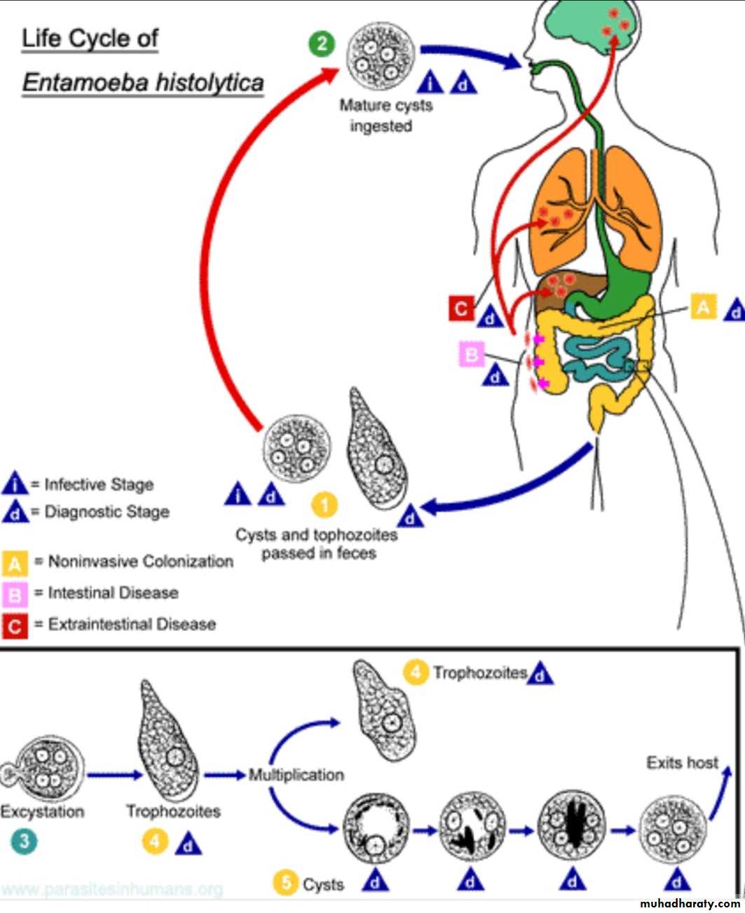 8 motile trophozoite settle in the lumen of the large intestine ( trophozoite migrate to other organs in the body such as liver and may cause liver abscess).