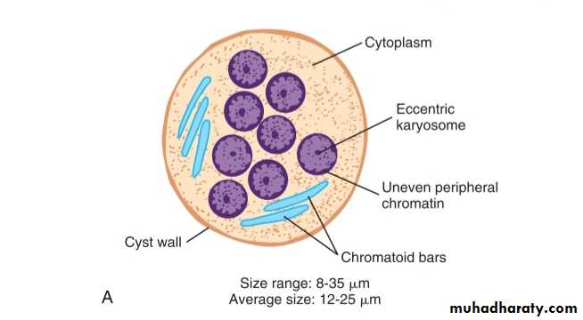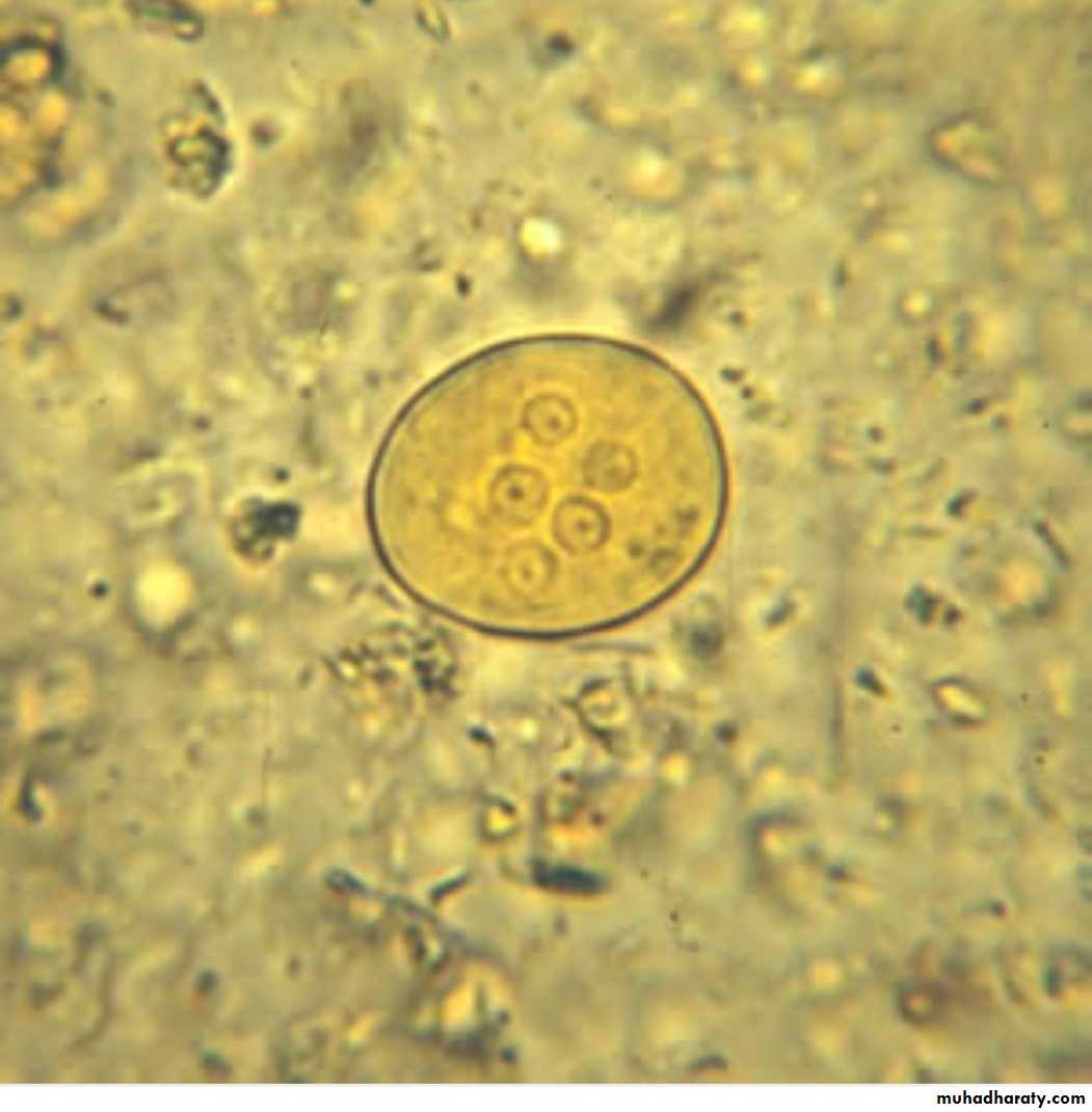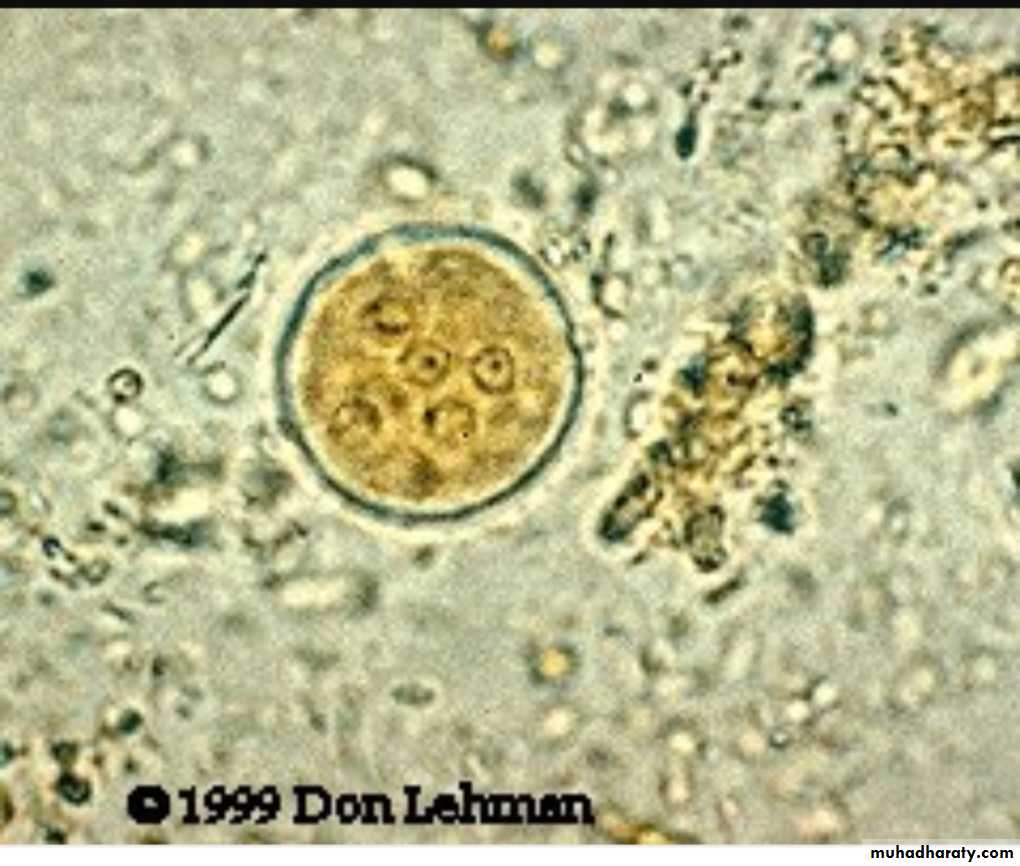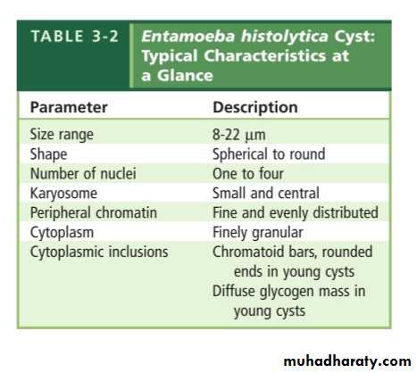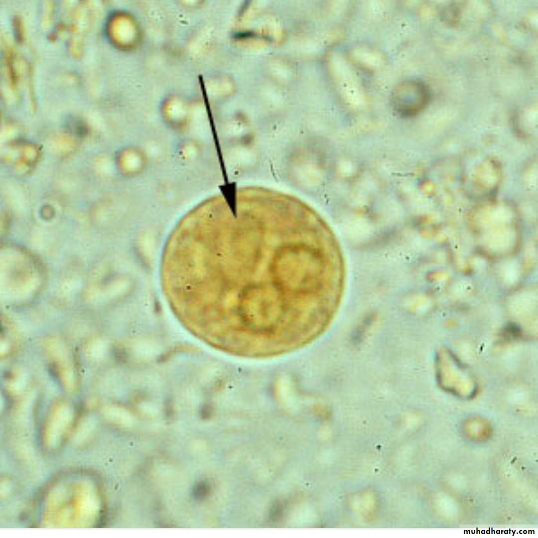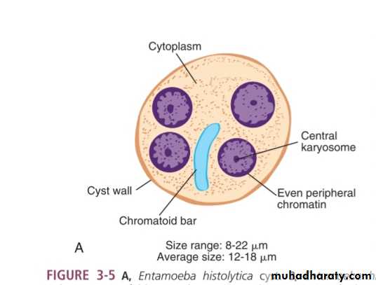 Encystation occurs in the lumen of large intestine and cyst formation complete when four nuclei are present.