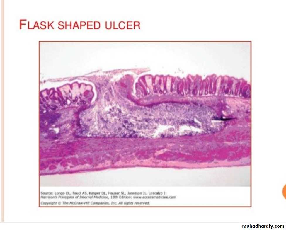 • Flask shape ulcer in the colon, cecum, recto sigmoidal area.