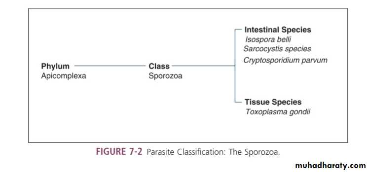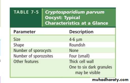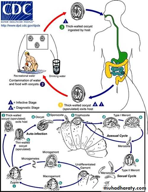 Infection occur by water and food contaminated with infected feces with oocyst.