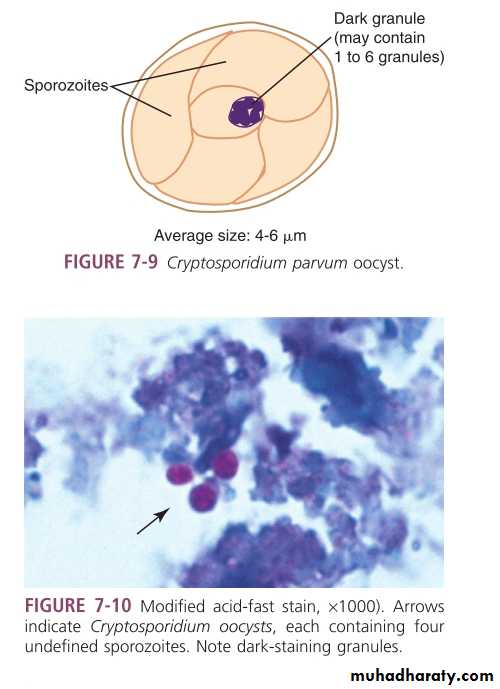 Cryptosporidiosis:healthy persons infected with cryptosporidium typically complain of diarrhea,which is self limiting and lasts approximately 2 weeks.Immunocompromized individuals(AIDS) usually suffer from sever diarrhea.