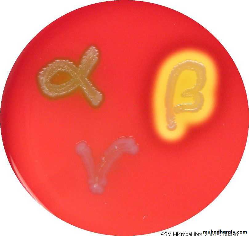 • γ Hemolytic: (No hemolysis is seen), e.g. Enterococci